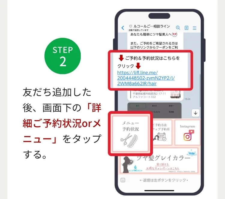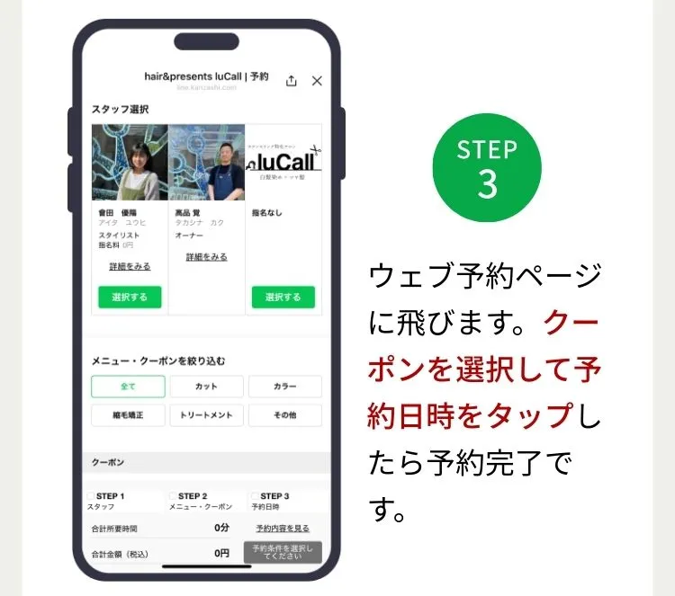 ラインからのウェブ予約もご用意してますのでボタン1つで簡単にご予約をお取りすることが可能になります。
