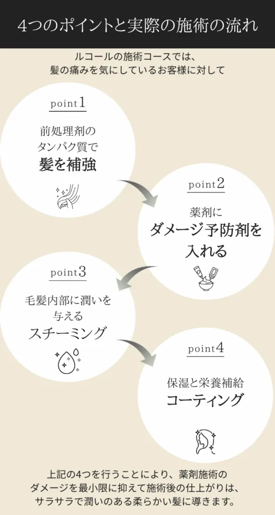 ルコールの髪質改善は、髪の状態やダメージレベルを丁寧に診断したうえで、必要な栄養・タンパク質・水分・熱のバランスを整える“オーダーメイドのケア”を行います。