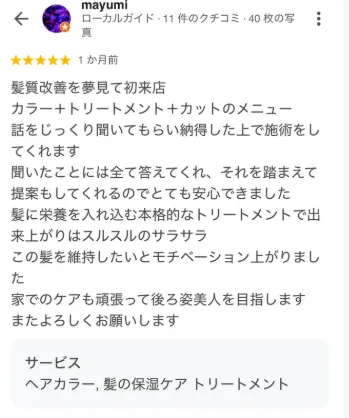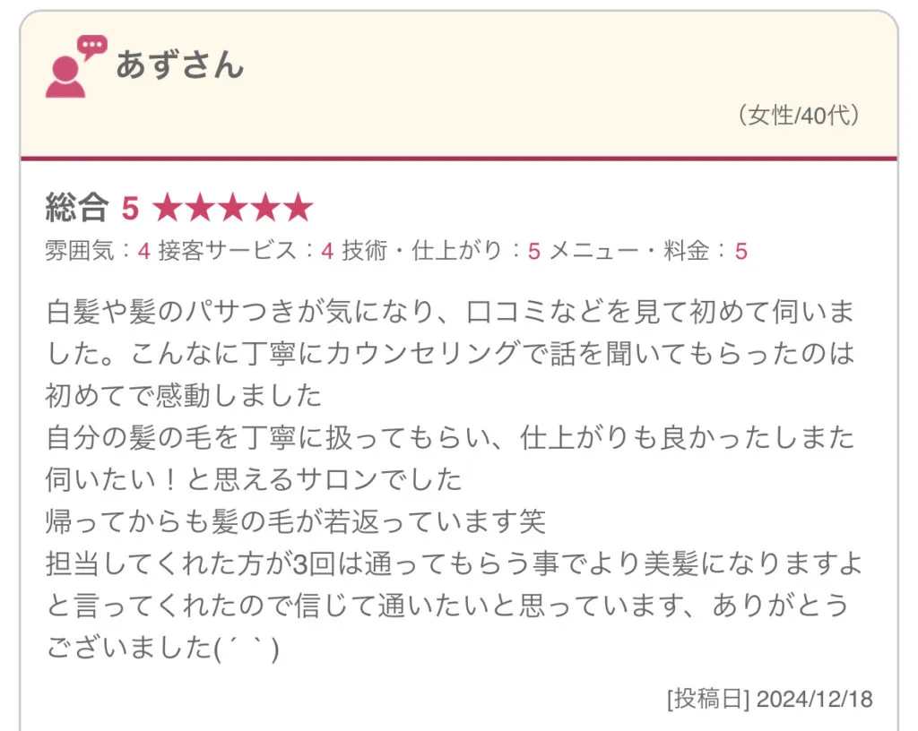 また、当店は次回予約を頂いている為、2週間ほど予約がとりづらい状況になっています。