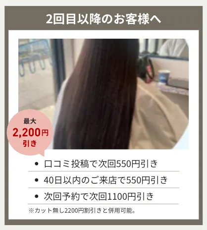 2回目以降の施術に関しましては、初めてご来店いただいた際に、次回以降の割引特典(最大 毎回3,300円引き)をご用意させていただいております。